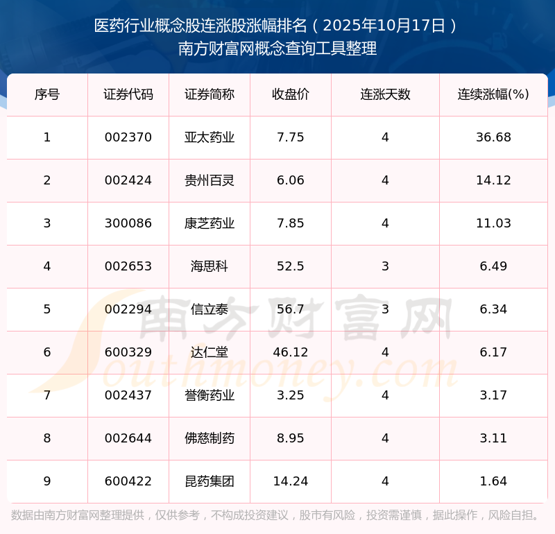 2025年10月17日醫(yī)藥行業(yè)概念股連漲股漲幅排名