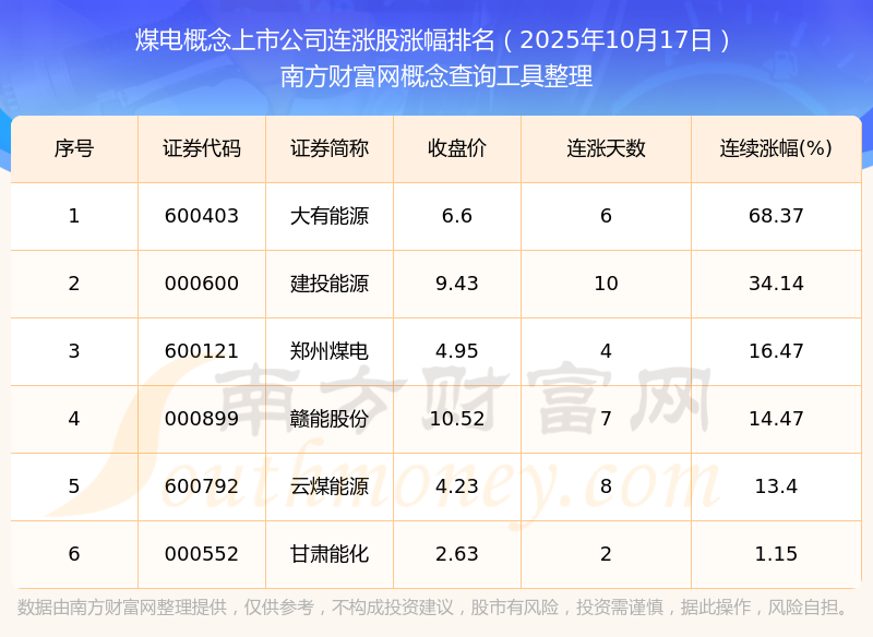 2025年10月17日煤電概念上市公司連漲股漲幅排名