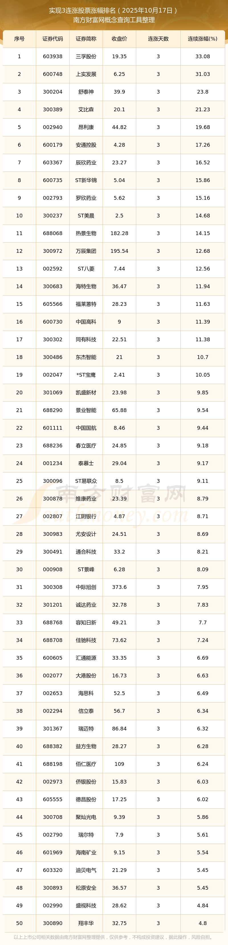 根據(jù)南方財(cái)富網(wǎng)概念查詢工具數(shù)據(jù)統(tǒng)計(jì),截止2025年10月17日收盤,共有75只個(gè)股實(shí)現(xiàn)3天連漲。其中連續(xù)漲幅較大的個(gè)股有三孚股份、上實(shí)發(fā)展、舒泰神等,連續(xù)漲幅分別為33.08%、31.03%、23.80%。
