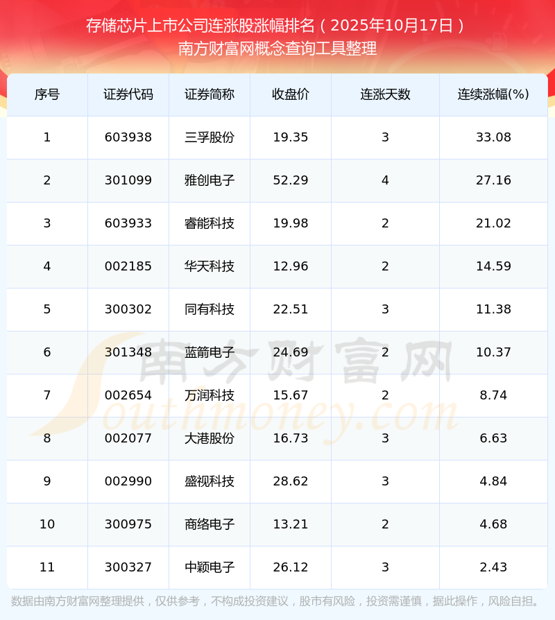 2025年10月17日存儲(chǔ)芯片上市公司連漲股漲幅排名