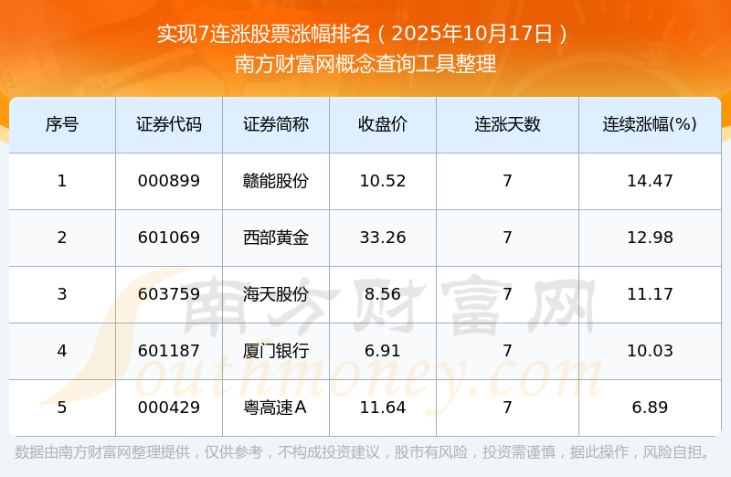 根據(jù)南方財富網(wǎng)概念查詢工具數(shù)據(jù)統(tǒng)計,截止2025年10月17日收盤,共有5只個股實現(xiàn)7天連漲。其中連續(xù)漲幅較大的個股有贛能股份、西部黃金、海天股份等,連續(xù)漲幅分別為14.47%、12.98%、11.17%。