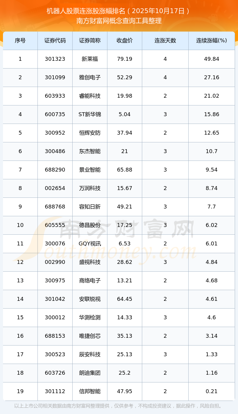 根據(jù)南方財富網(wǎng)概念查詢工具數(shù)據(jù)統(tǒng)計,截止2025年10月17日收盤,機器人股票共有19只個股實現(xiàn)連漲。其中連續(xù)漲幅較大的個股有新萊福、雅創(chuàng)電子、睿能科技等,連續(xù)漲幅分別為49.84%、27.16%、21.02%。