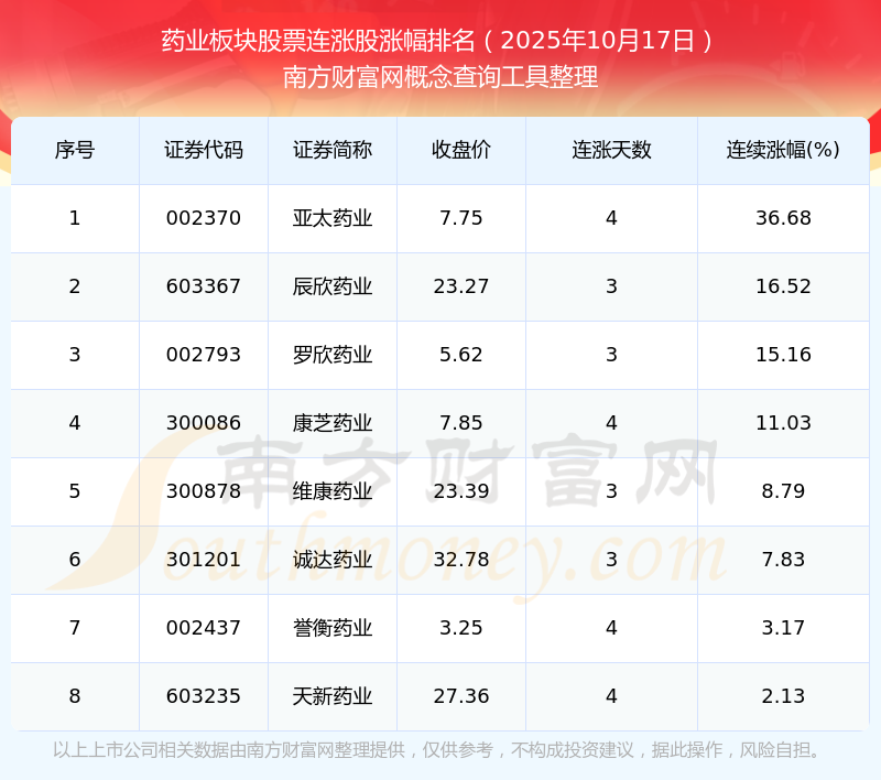 2025年10月17日藥業(yè)板塊股票連漲股漲幅排名