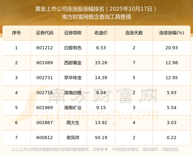 根據(jù)南方財(cái)富網(wǎng)概念查詢工具數(shù)據(jù)統(tǒng)計(jì),截止2025年10月17日收盤,黃金上市公司共有7只個(gè)股實(shí)現(xiàn)連漲。其中連續(xù)漲幅較大的個(gè)股有白銀有色、西部黃金、萃華珠寶等,連續(xù)漲幅分別為20.93%、12.98%、12.95%。