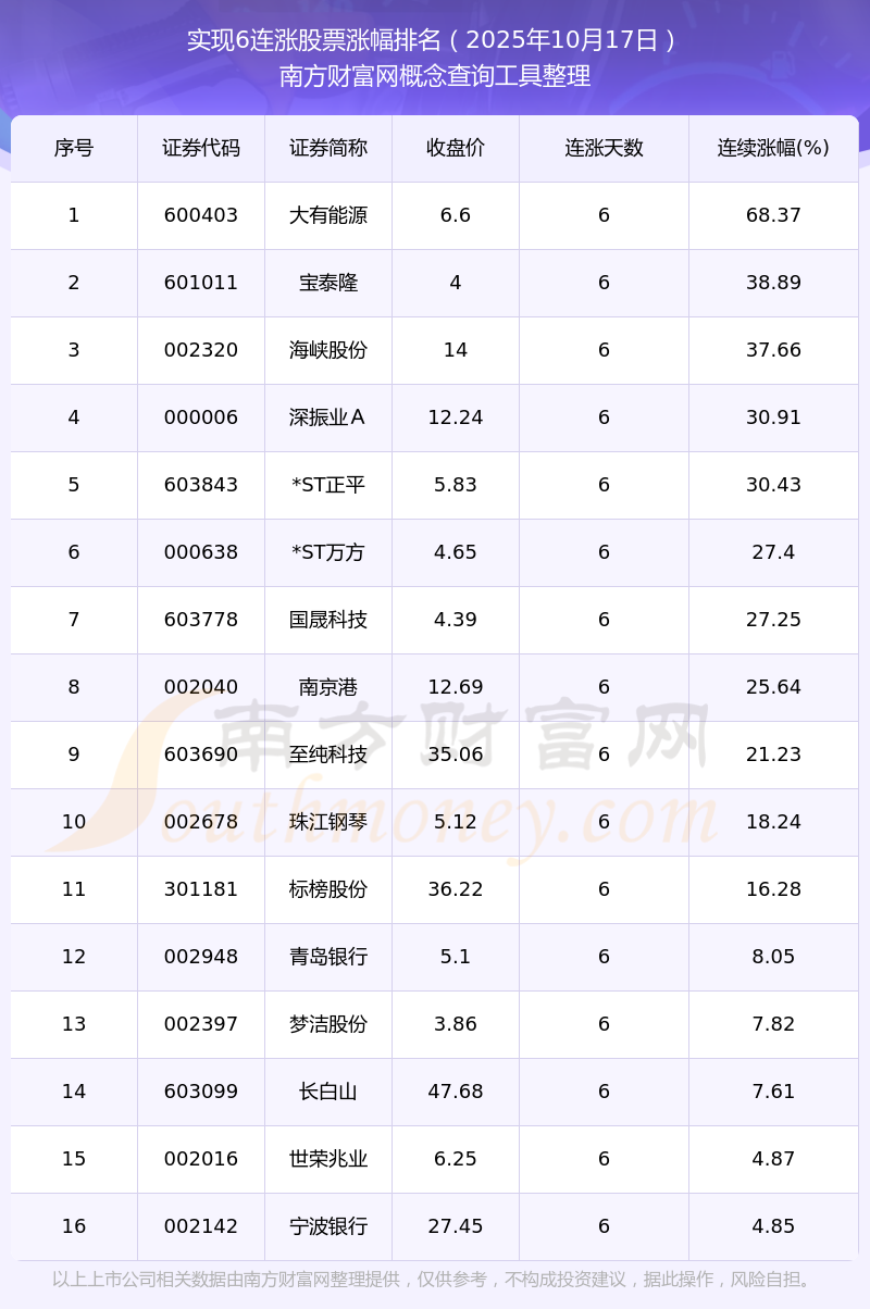 2025年10月17日實(shí)現(xiàn)6連漲股票漲幅排名