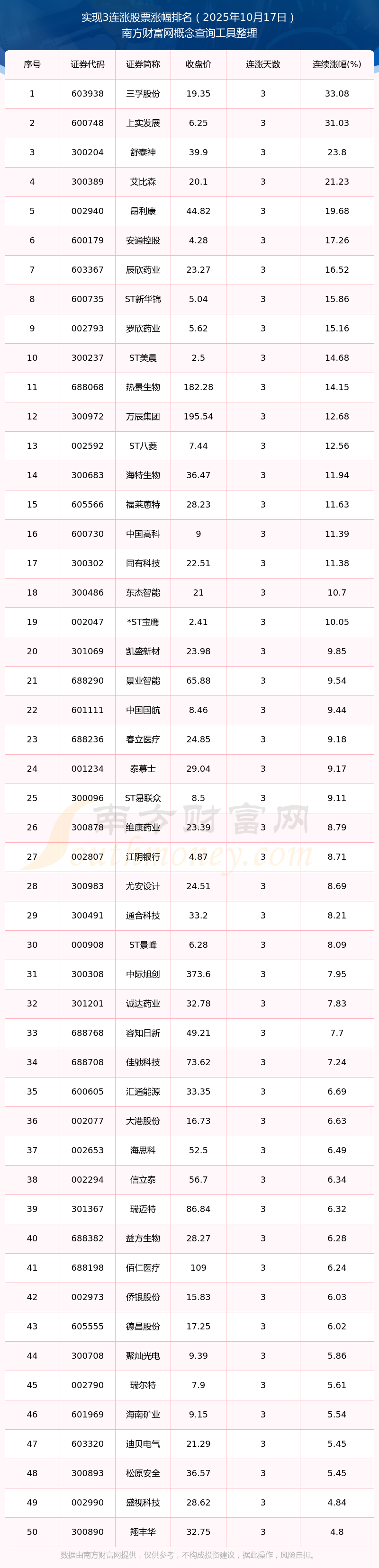 2025年10月17日實(shí)現(xiàn)3連漲股票漲幅排名