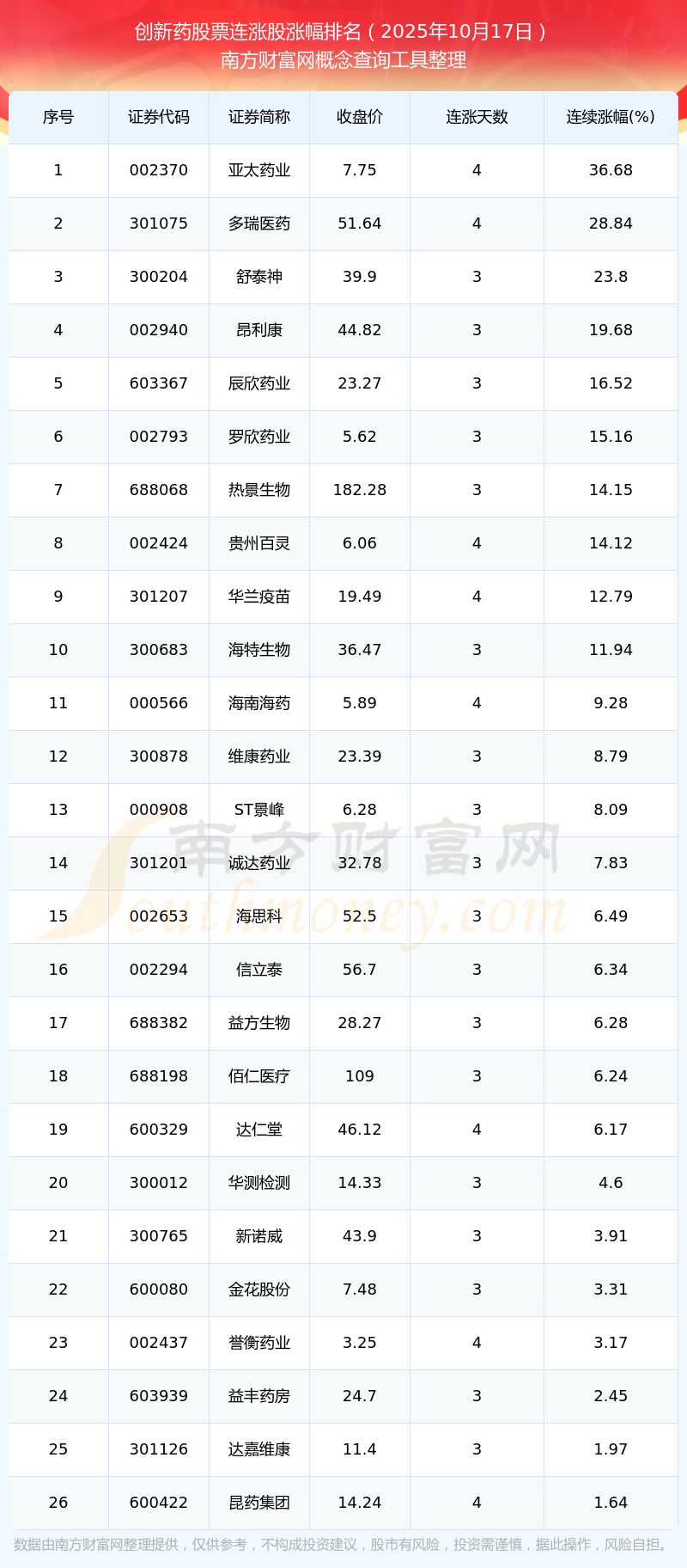 2025年10月17日創(chuàng)新藥股票連漲股票漲幅排名