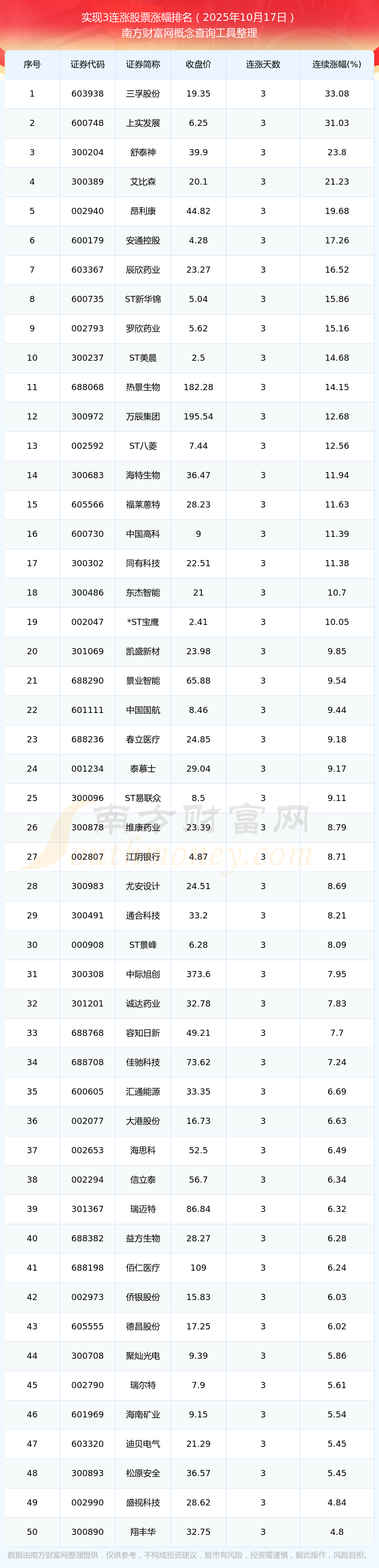 2025年10月17日實(shí)現(xiàn)3連漲股票漲幅排名