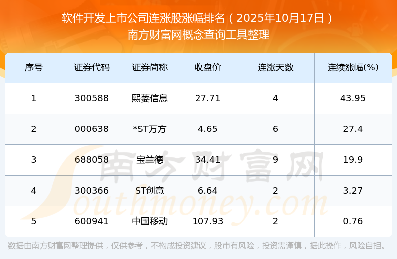 2025年10月17日軟件開發(fā)上市公司連漲股漲幅排名