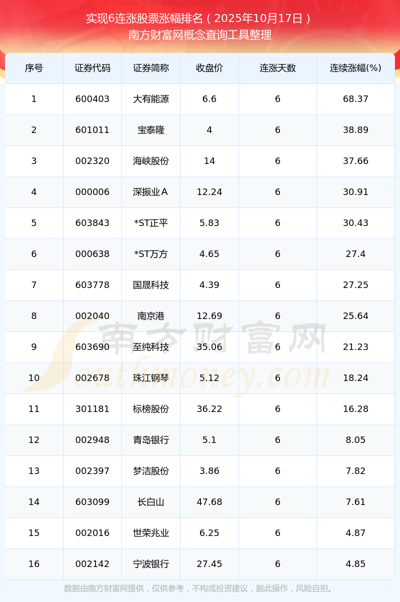 2025年10月17日實(shí)現(xiàn)6連漲股票漲幅排名