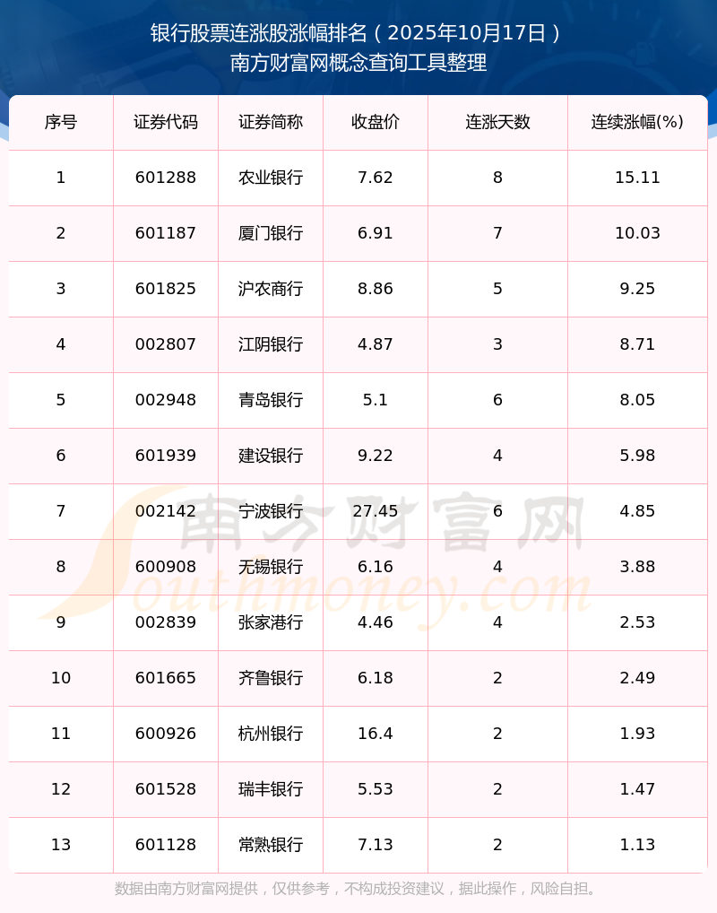 2025年10月17日銀行股票連漲股漲幅排名