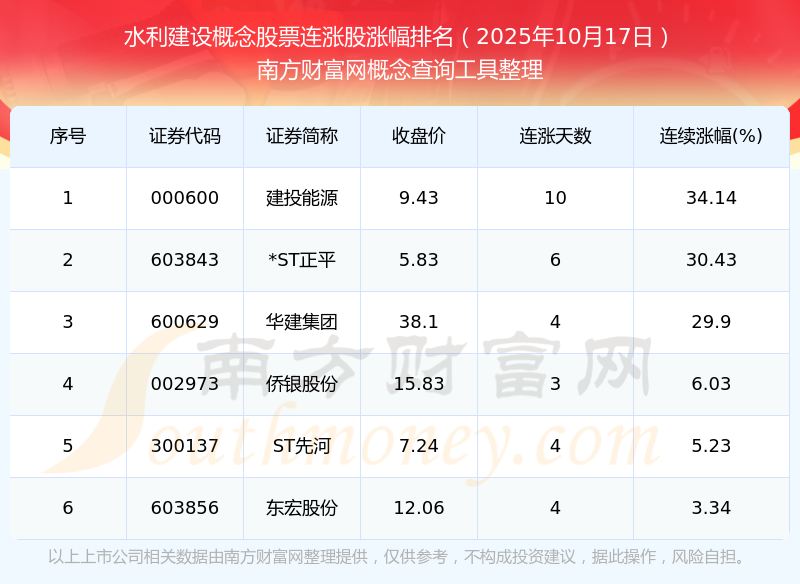 2025年10月17日水利建設(shè)概念股票連漲股漲幅排名