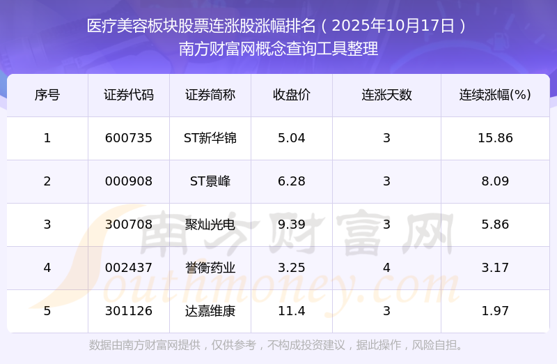 根據(jù)南方財富網(wǎng)概念查詢工具數(shù)據(jù)統(tǒng)計,截止2025年10月17日收盤,醫(yī)療美容板塊股票共有5只個股實現(xiàn)連漲。其中連續(xù)漲幅較大的個股有ST新華錦、ST景峰、聚燦光電等,連續(xù)漲幅分別為15.86%、8.09%、5.86%。