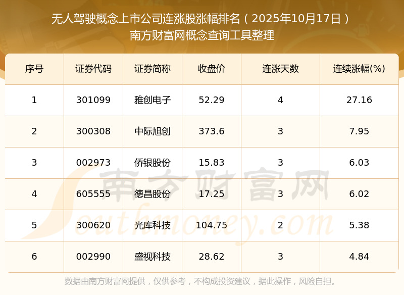 2025年10月17日無人駕駛概念上市公司連漲股漲幅排名