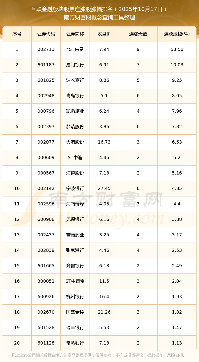 根據南方財富網概念查詢工具數據統計,截止2025年10月17日收盤,互聯金融板塊股票共有20只個股實現連漲。其中連續(xù)漲幅較大的個股有*ST東易、廈門銀行、滬農商行等,連續(xù)漲幅分別為53.58%、10.03%、9.25%。