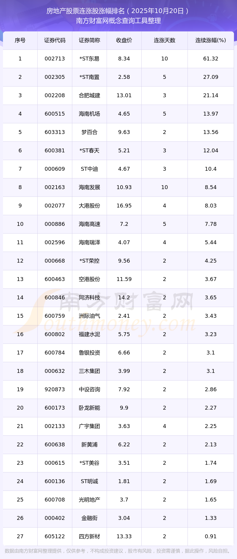 根據(jù)南方財(cái)富網(wǎng)概念查詢工具數(shù)據(jù)統(tǒng)計(jì),截止2025年10月20日收盤,房地產(chǎn)股票共有27只個(gè)股實(shí)現(xiàn)連漲。其中連續(xù)漲幅較大的個(gè)股有*ST東易、*ST南置、合肥城建等,連續(xù)漲幅分別為61.32%、27.09%、21.14%。