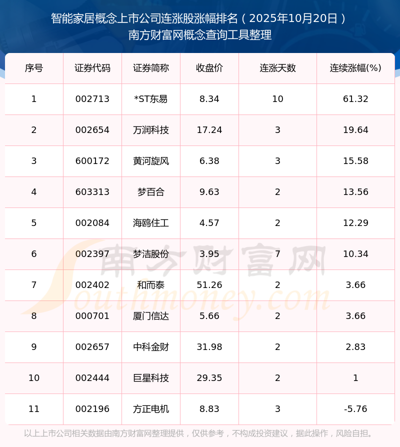 根據(jù)南方財富網(wǎng)概念查詢工具數(shù)據(jù)統(tǒng)計,截止2025年10月20日收盤,智能家居概念上市公司共有11只個股實現(xiàn)連漲。其中連續(xù)漲幅較大的個股有*ST東易、萬潤科技、黃河旋風等,連續(xù)漲幅分別為61.32%、19.64%、15.58%。