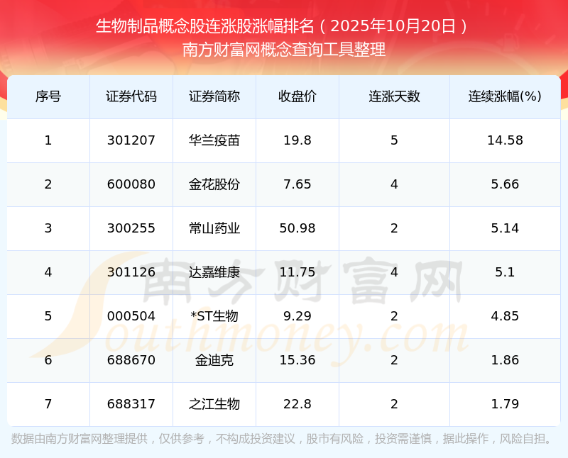 根據(jù)南方財富網(wǎng)概念查詢工具數(shù)據(jù)統(tǒng)計,截止2025年10月20日收盤,生物制品概念股共有7只個股實現(xiàn)連漲。其中連續(xù)漲幅較大的個股有華蘭疫苗、金花股份、常山藥業(yè)等,連續(xù)漲幅分別為14.58%、5.66%、5.14%。