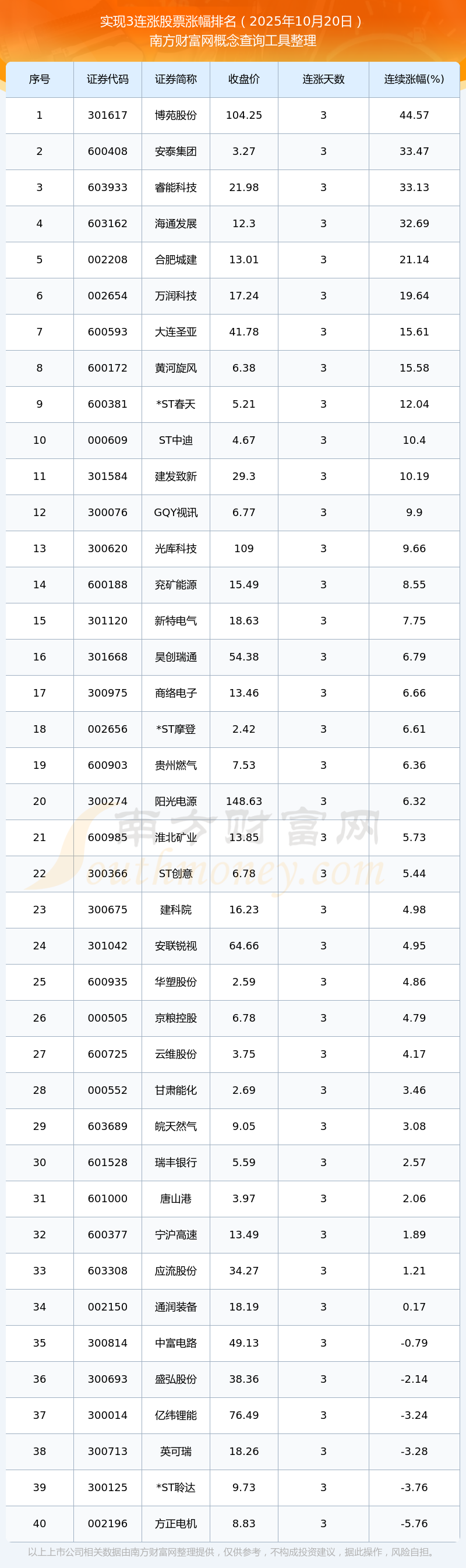 2025年10月20日實(shí)現(xiàn)3連漲股票漲幅排名