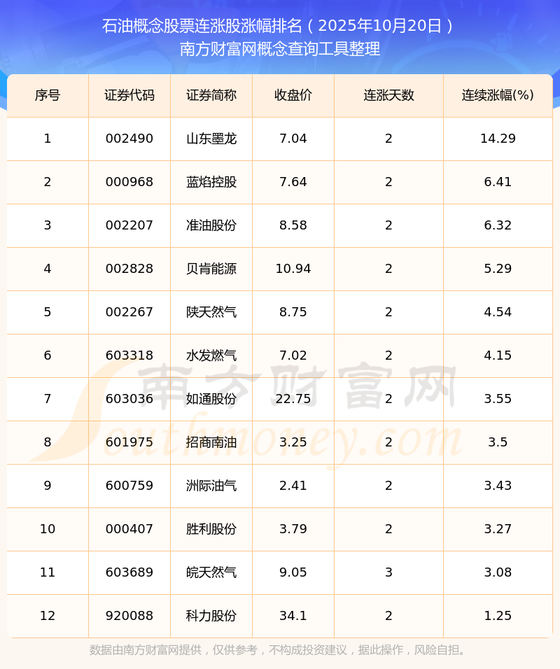 根據(jù)南方財(cái)富網(wǎng)概念查詢工具數(shù)據(jù)統(tǒng)計(jì),截止2025年10月20日收盤,石油概念股票共有12只個(gè)股實(shí)現(xiàn)連漲。其中連續(xù)漲幅較大的個(gè)股有山東墨龍、藍(lán)焰控股、準(zhǔn)油股份等,連續(xù)漲幅分別為14.29%、6.41%、6.32%。