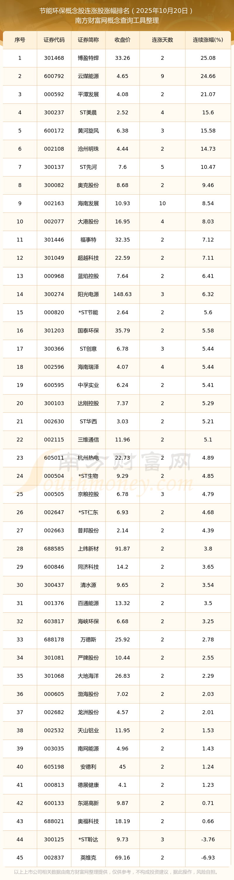 2025年10月20日節(jié)能環(huán)保概念股連漲股漲幅排名