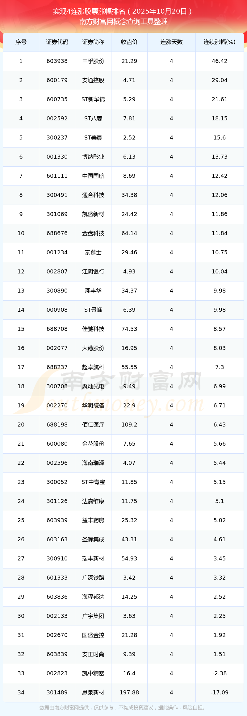 2025年10月20日實現(xiàn)4連漲股票漲幅排名