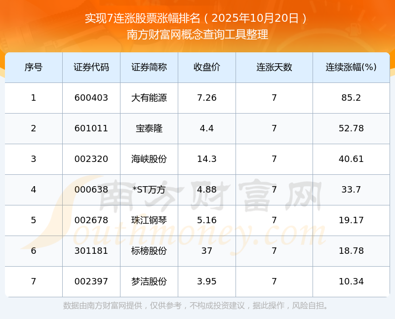 2025年10月20日實(shí)現(xiàn)7連漲股票漲幅排名