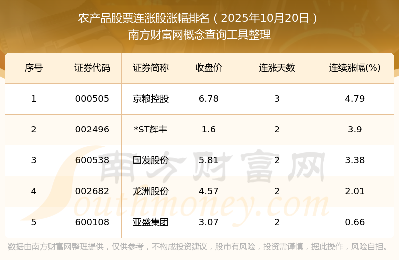 2025年10月20日農(nóng)產(chǎn)品股票連漲股漲幅排名