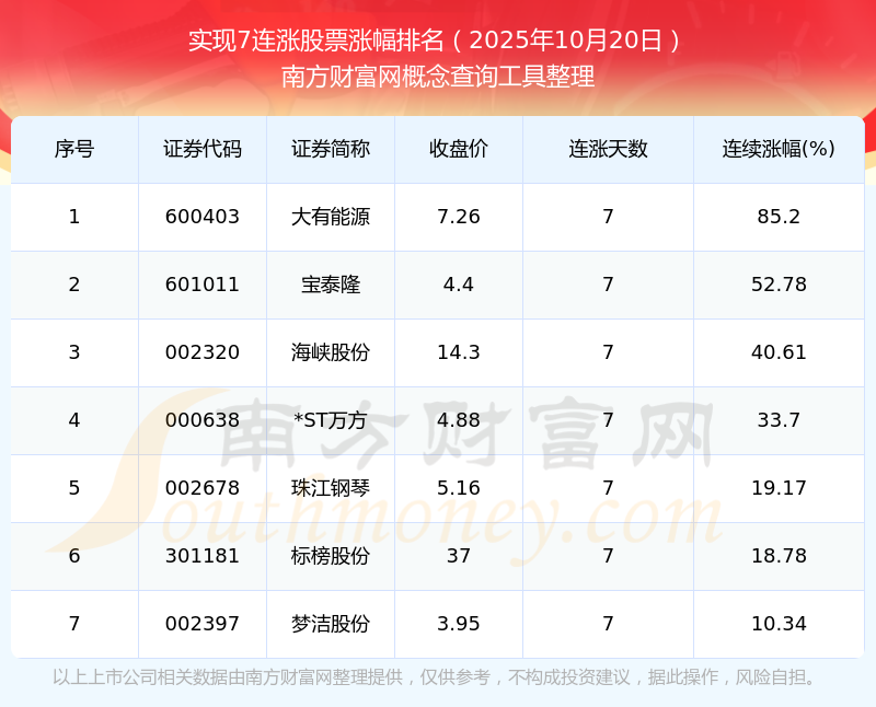 2025年10月20日實現(xiàn)7連漲股票漲幅排名
