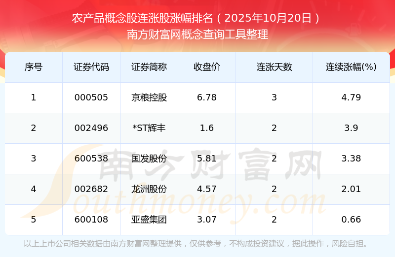 根據(jù)南方財(cái)富網(wǎng)概念查詢工具數(shù)據(jù)統(tǒng)計(jì),截止2025年10月20日收盤,農(nóng)產(chǎn)品概念股共有5只個(gè)股實(shí)現(xiàn)連漲。其中連續(xù)漲幅較大的個(gè)股有京糧控股、*ST輝豐、國發(fā)股份等,連續(xù)漲幅分別為4.79%、3.90%、3.38%。