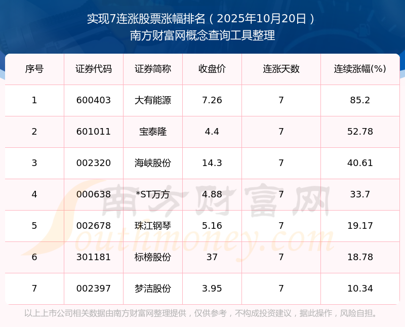 根據(jù)南方財富網(wǎng)概念查詢工具數(shù)據(jù)統(tǒng)計,截止2025年10月20日收盤,共有7只個股實現(xiàn)7天連漲。其中連續(xù)漲幅較大的個股有大有能源、寶泰隆、海峽股份等,連續(xù)漲幅分別為85.20%、52.78%、40.61%。