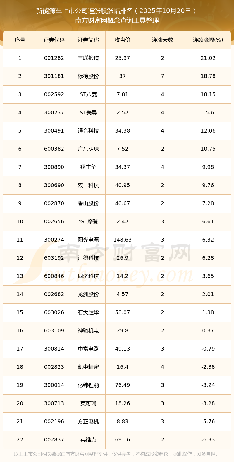 2025年10月20日新能源車上市公司連漲股漲幅排名