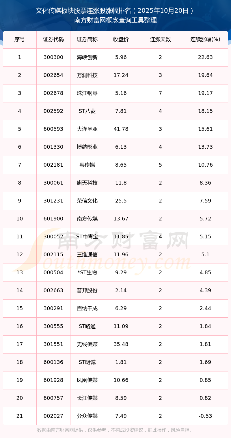 2025年10月20日文化傳媒板塊股票連漲股漲幅排名