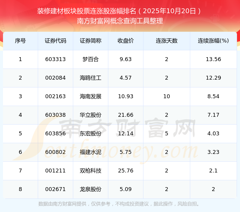2025年10月20日裝修建材板塊股票連漲股漲幅排名