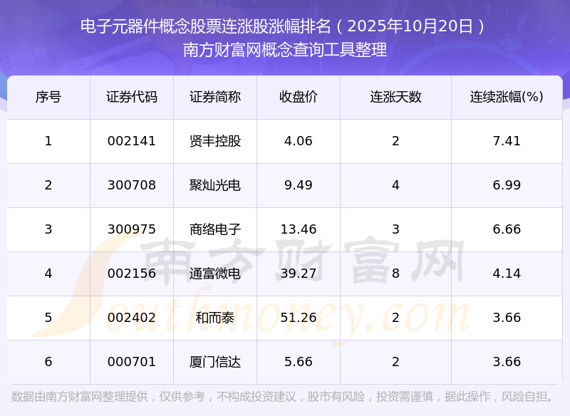 2025年10月20日電子元器件概念股票連漲股漲幅排名