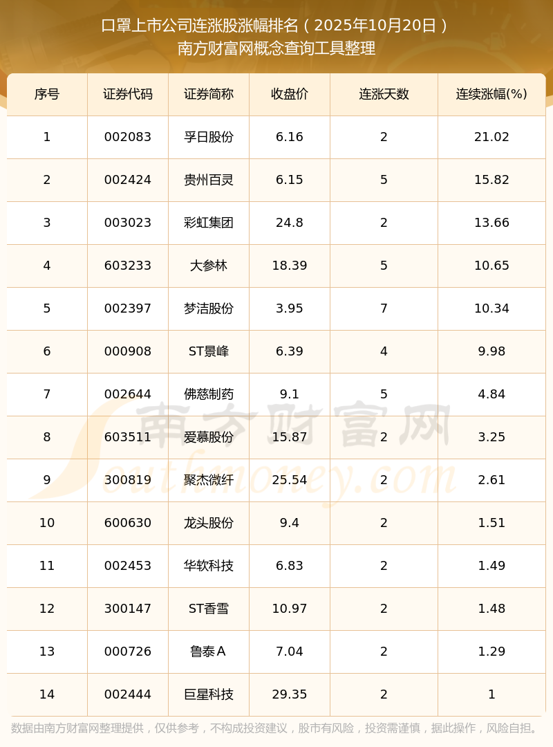 2025年10月20日口罩上市公司連漲股漲幅排名