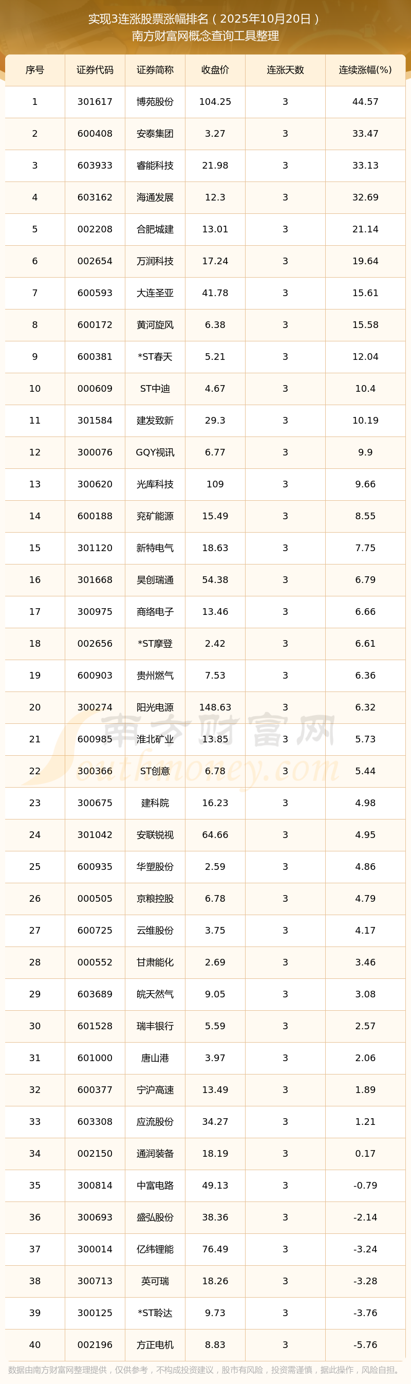 【今日股市行情】2025年10月20日40只股票實(shí)現(xiàn)3連漲!