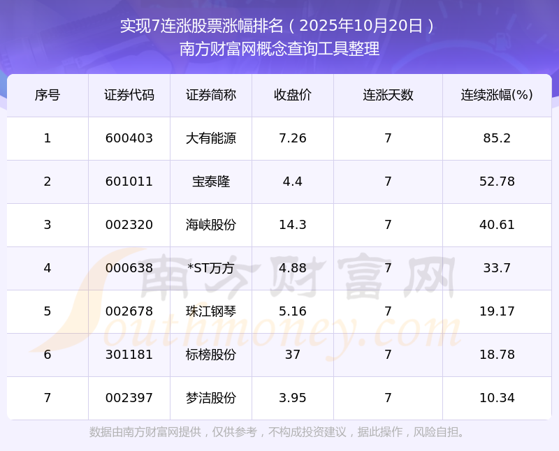 2025年10月20日實(shí)現(xiàn)7連漲股票漲幅排名