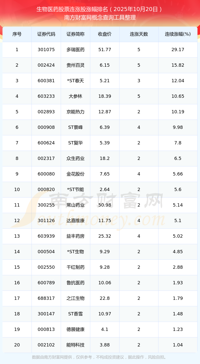 2025年10月20日生物醫(yī)藥股票連漲股漲幅排名