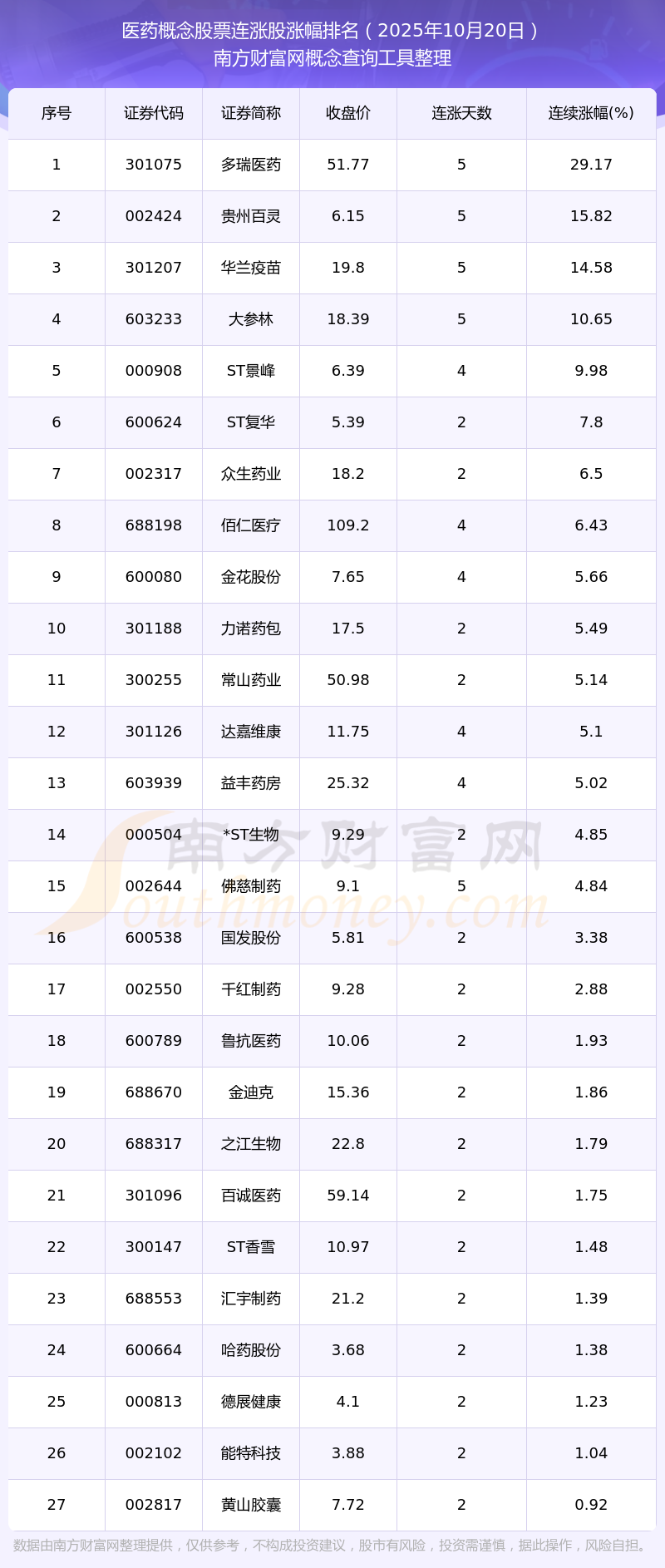 2025年10月20日醫(yī)藥概念股票連漲股漲幅排名