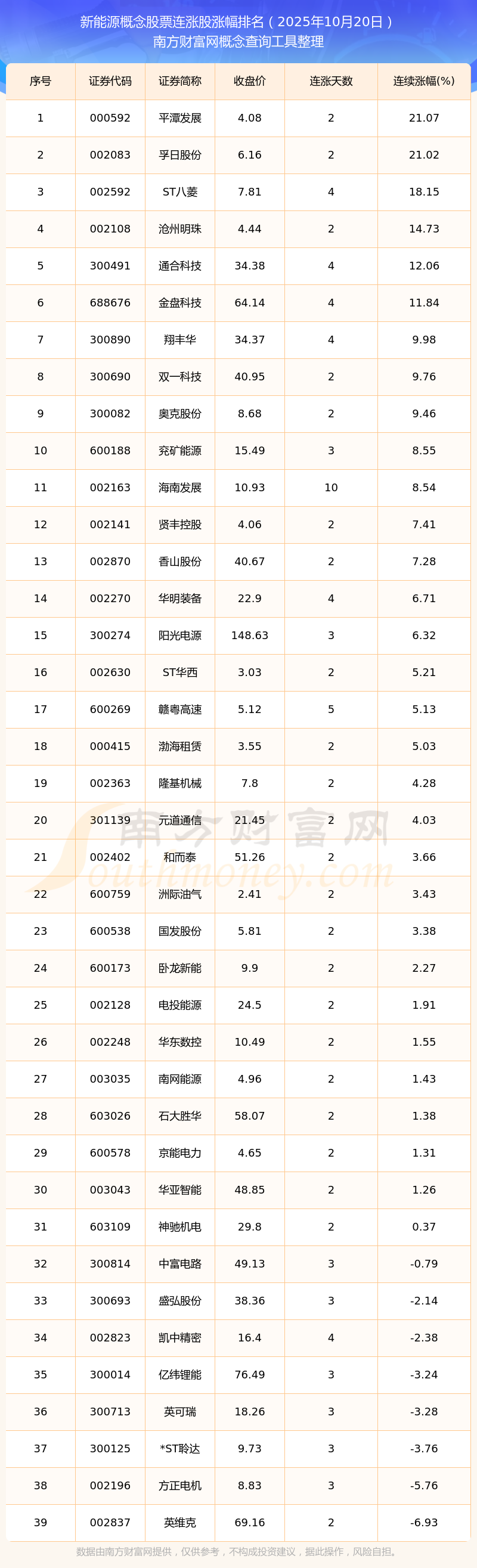 根據(jù)南方財(cái)富網(wǎng)概念查詢工具數(shù)據(jù)統(tǒng)計(jì),截止2025年10月20日收盤,新能源概念股票共有39只個(gè)股實(shí)現(xiàn)連漲。其中連續(xù)漲幅較大的個(gè)股有平潭發(fā)展、孚日股份、ST八菱等,連續(xù)漲幅分別為21.07%、21.02%、18.15%。