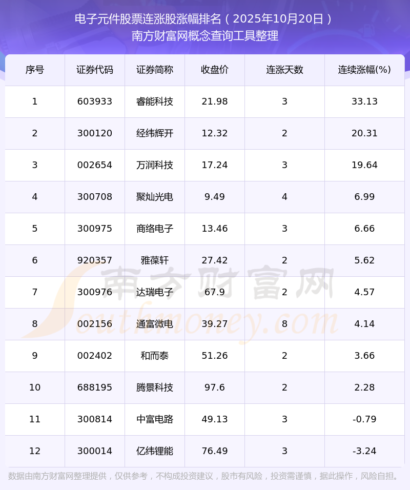 2025年10月20日電子元件股票連漲股漲幅排名