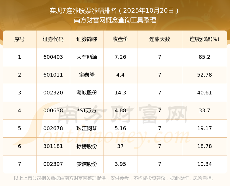2025年10月20日實(shí)現(xiàn)7連漲股票漲幅排名