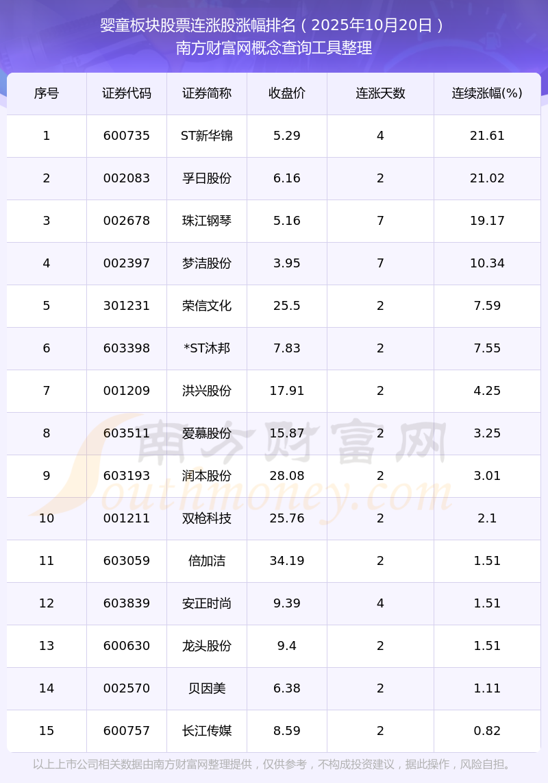 2025年10月20日嬰童板塊股票連漲股漲幅排名