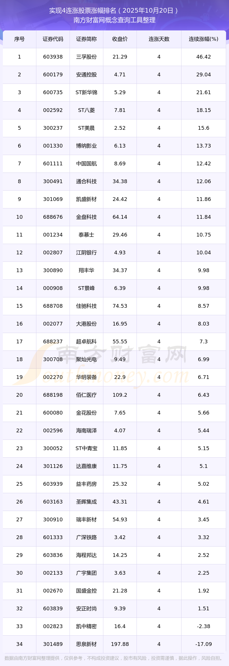 根據(jù)南方財(cái)富網(wǎng)概念查詢(xún)工具數(shù)據(jù)統(tǒng)計(jì),截止2025年10月20日收盤(pán),共有34只個(gè)股實(shí)現(xiàn)4天連漲。其中連續(xù)漲幅較大的個(gè)股有三孚股份、安通控股、ST新華錦等,連續(xù)漲幅分別為46.42%、29.04%、21.61%。