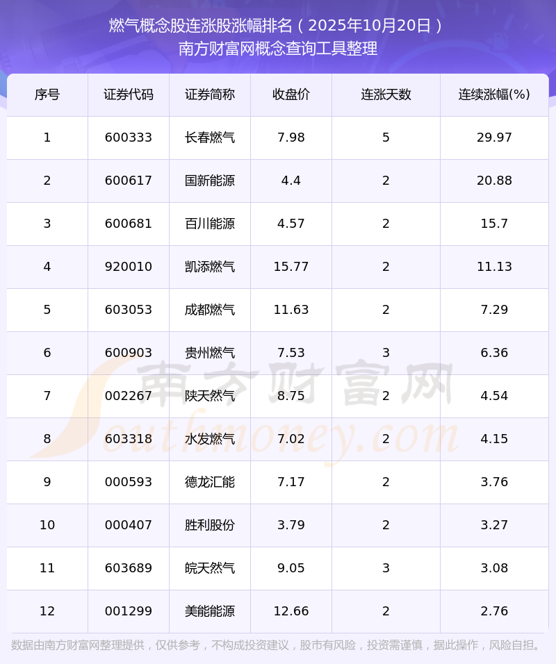 2025年10月20日燃?xì)飧拍罟蛇B漲股漲幅排名