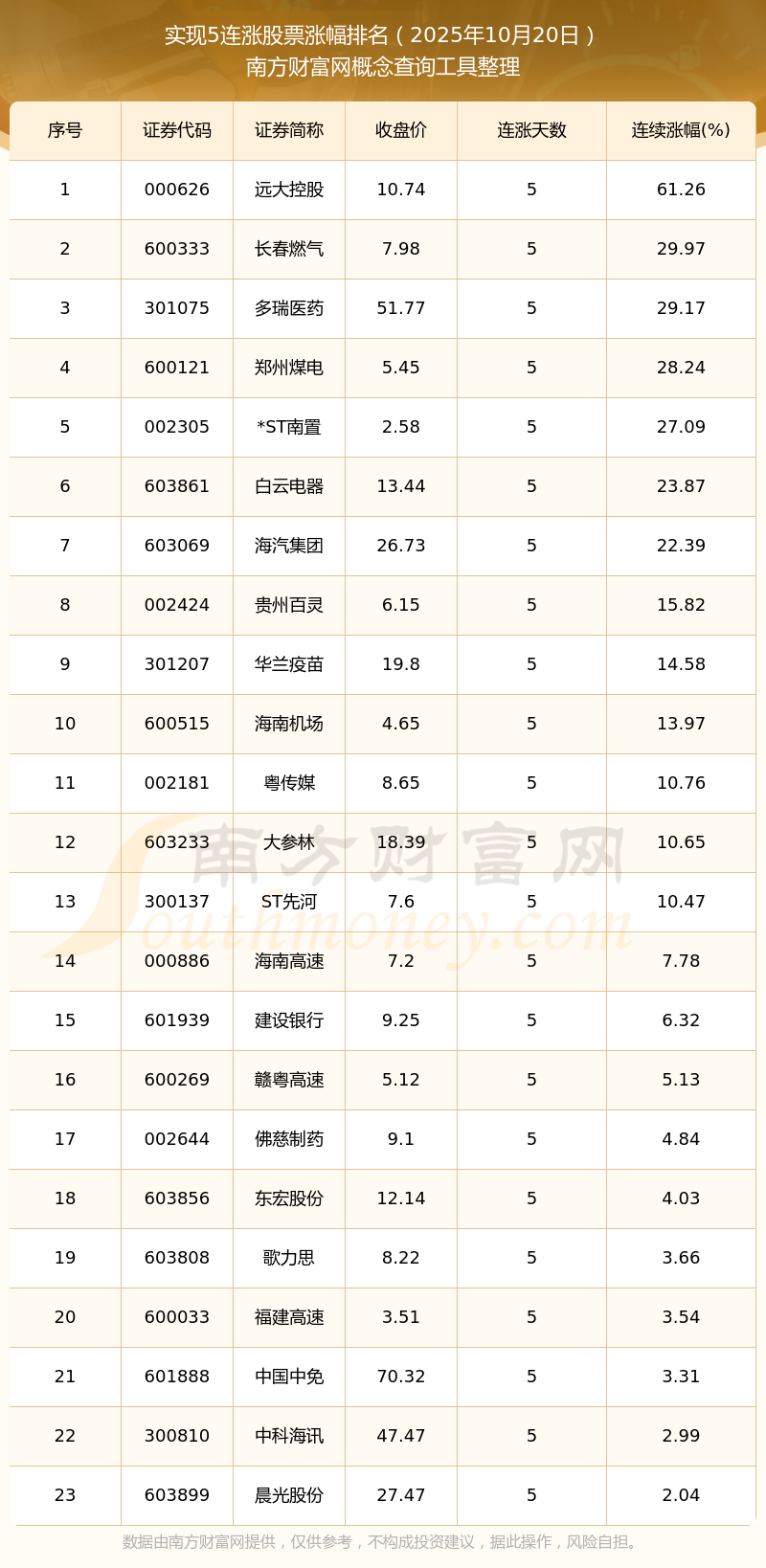 2025年10月20日實現(xiàn)5連漲股票漲幅排名