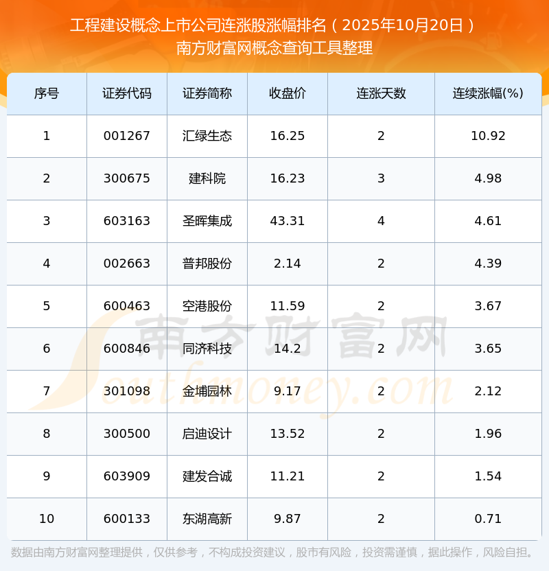 2025年10月20日工程建設概念上市公司連漲股漲幅排名