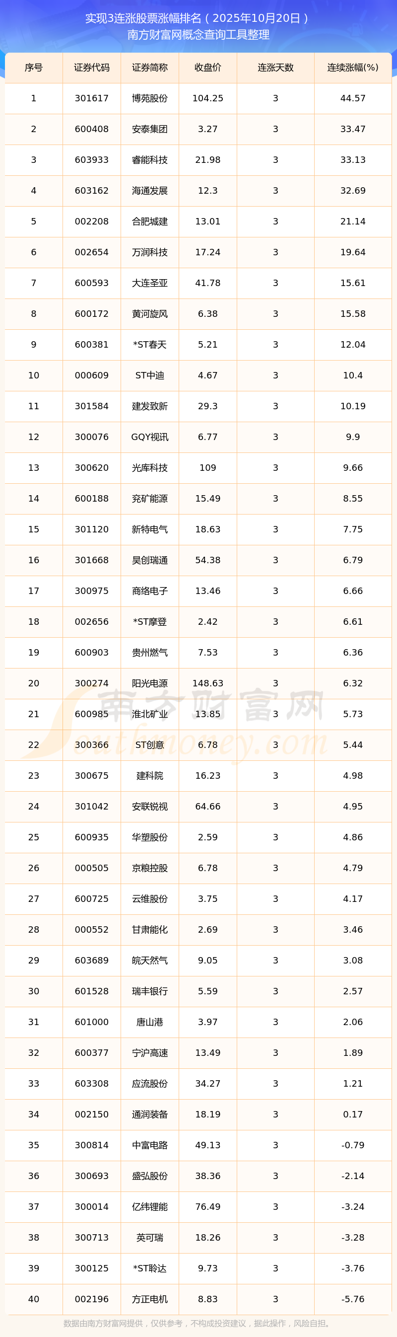 2025年10月20日實(shí)現(xiàn)3連漲股票漲幅排名