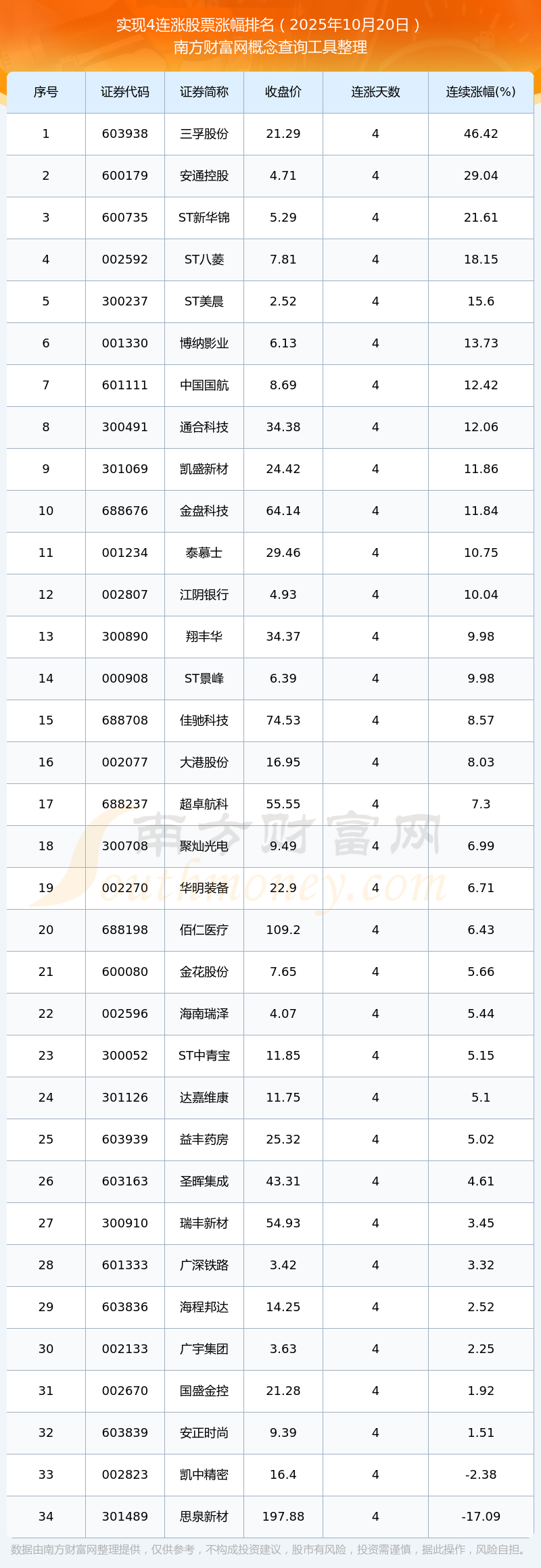根據(jù)南方財富網(wǎng)概念查詢工具數(shù)據(jù)統(tǒng)計,截止2025年10月20日收盤,共有34只個股實現(xiàn)4天連漲。其中連續(xù)漲幅較大的個股有三孚股份、安通控股、ST新華錦等,連續(xù)漲幅分別為46.42%、29.04%、21.61%。